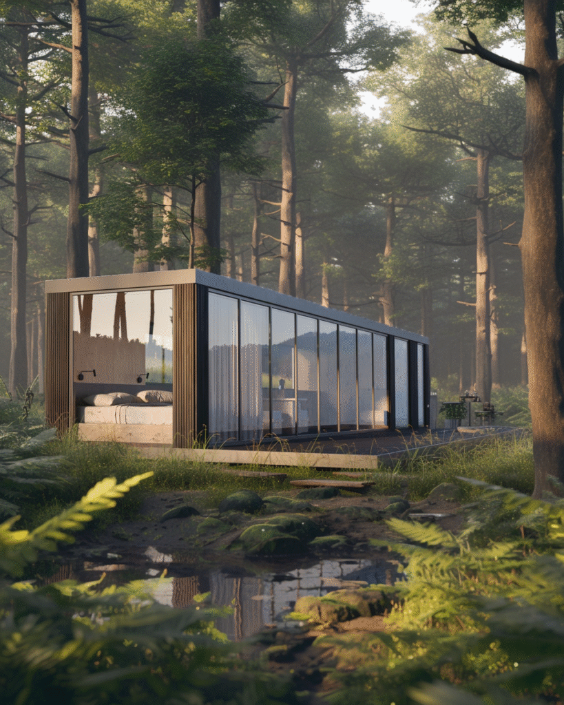 Materiały i wykończenia w domach modułowych całorocznych, energooszczędnych, z drewna i szkła.